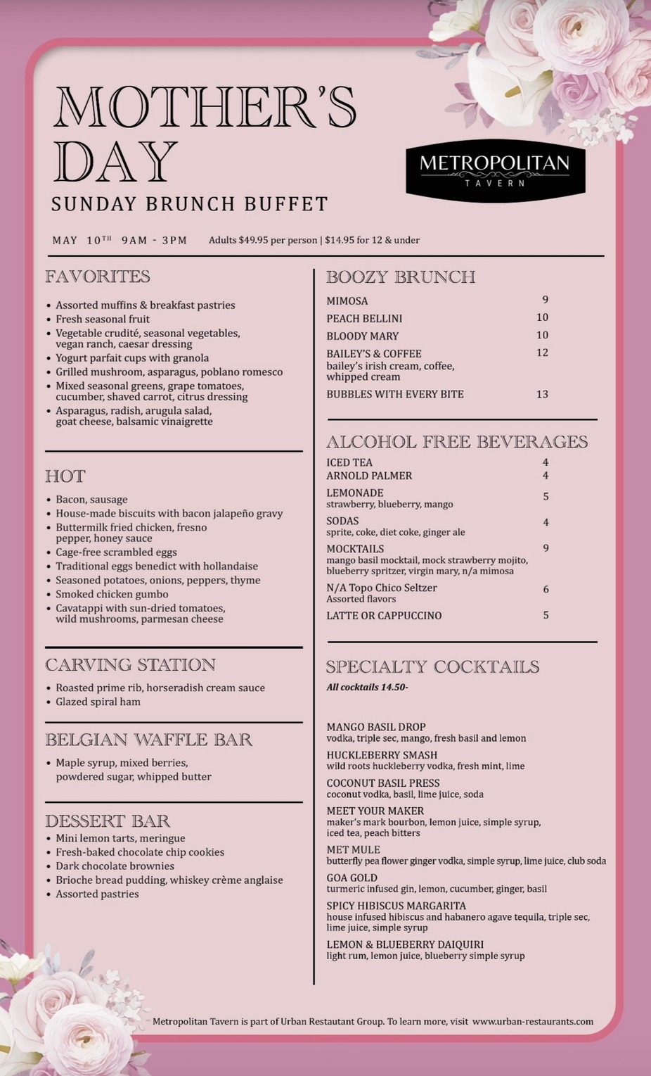 🗓 May 10th | 9AM–3PM 💲 Adults $49.95 | Kids 12 & under $14.95 🥂 Rooftop Brunch Buffet Menu Only 📍 Metropolitan Tavern – Portland